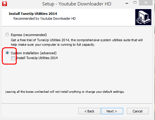 2.安裝時,點選「自定義安裝」。YouTube Downloader HD會詢問是否要安裝第三方軟體,建議都不要勾選。注意"囗"勾選的項目,儘可能的取清,避免被強迫安裝不必要的小軟體!