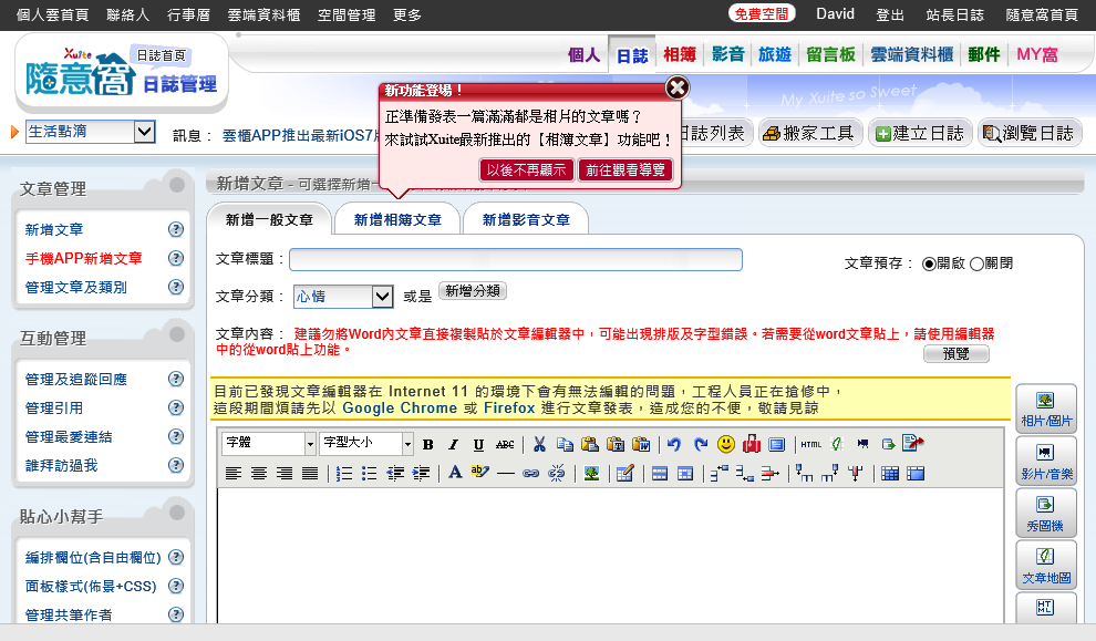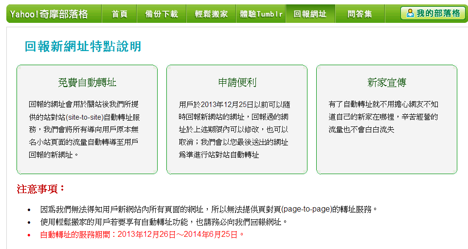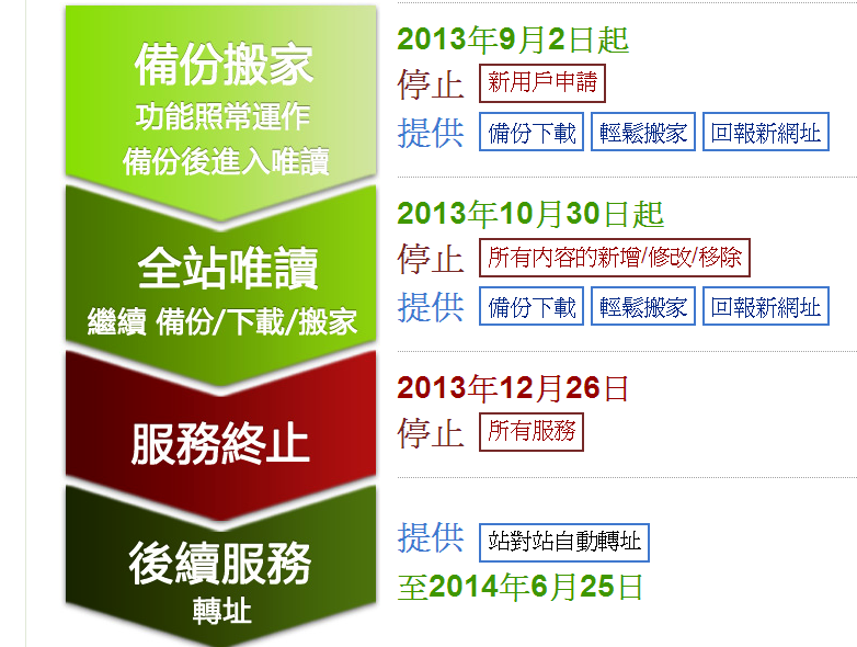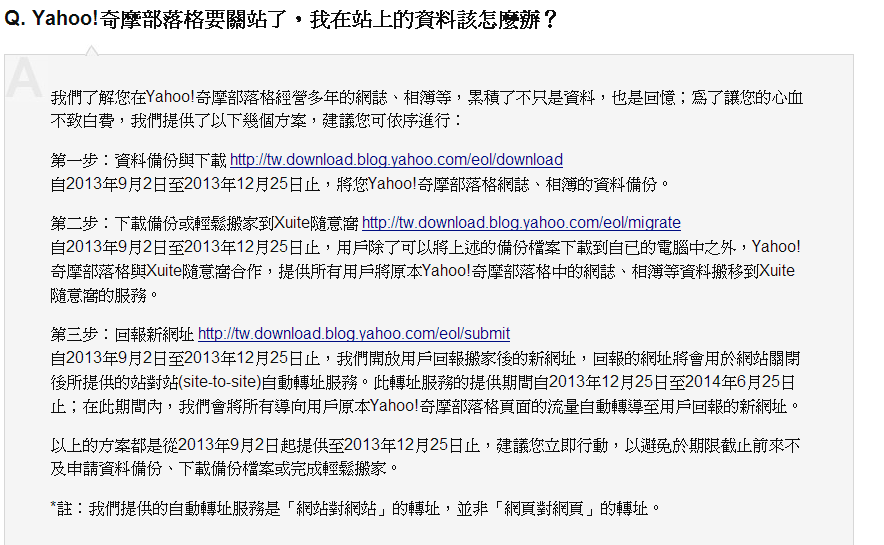 <div class="MsoNormal" style="text-align: left;"><span style="font-size: large;"><span style="font-family: "新細明體","serif"; mso-ascii-font-family: Calibri; mso-ascii-theme-font: minor-latin; mso-fareast-font-family: 新細明體; mso-fareast-theme-font: minor-fareast; mso-hansi-font-family: Calibri; mso-hansi-theme-font: minor-latin;">tw.yahoo.com 102.08.30 重要公告:</span><span lang="EN-US">Yahoo!</span><span style="font-family: "新細明體","serif"; mso-ascii-font-family: Calibri; mso-ascii-theme-font: minor-latin; mso-fareast-font-family: 新細明體; mso-fareast-theme-font: minor-fareast; mso-hansi-font-family: Calibri; mso-hansi-theme-font: minor-latin;">奇摩部落格將於</span><span lang="EN-US">2013</span><span style="font-family: "新細明體","serif"; mso-ascii-font-family: Calibri; mso-ascii-theme-font: minor-latin; mso-fareast-font-family: 新細明體; mso-fareast-theme-font: minor-fareast; mso-hansi-font-family: Calibri; mso-hansi-theme-font: minor-latin;">年</span><span lang="EN-US">12</span><span style="font-family: "新細明體","serif"; mso-ascii-font-family: Calibri; mso-ascii-theme-font: minor-latin; mso-fareast-font-family: 新細明體; mso-fareast-theme-font: minor-fareast; mso-hansi-font-family: Calibri; mso-hansi-theme-font: minor-latin;">月</span><span lang="EN-US">26</span><span style="font-family: "新細明體","serif"; mso-ascii-font-family: Calibri; mso-ascii-theme-font: minor-latin; mso-fareast-font-family: 新細明體; mso-fareast-theme-font: minor-fareast; mso-hansi-font-family: Calibri; mso-hansi-theme-font: minor-latin;">日終止服務</span><span style="font-family: 新細明體, serif;">。</span></span></div><div class="MsoNormal" style="text-align: left;"><span style="font-size: large;"><span style="text-align: center;">所以開始搬家</span>了<span style="text-align: center;">!</span></span></div><div class="separator" style="clear: both; text-align: left;"><br></div><div class="separator" style="clear: both; text-align: center;"><a href="http://3.bp.blogspot.com/-ujEHLzk4FD0/UpraQXP-vLI/AAAAAAAADjY/GitmWMH8xjg/s1600/Y1.png" imageanchor="1" style="margin-left: 1em; margin-right: 1em;"><img border="0" height="482" src="http://3.bp.blogspot.com/-ujEHLzk4FD0/UpraQXP-vLI/AAAAAAAADjY/GitmWMH8xjg/s640/Y1.png" width="640"></a></div><br><br><div class="separator" style="clear: both; text-align: center;"><a href="http://2.bp.blogspot.com/-7UBD5Ic3Mo0/UpraQGGPO9I/AAAAAAAADjQ/EAJogYiPAfI/s1600/Y2.png" imageanchor="1" style="margin-left: 1em; margin-right: 1em;"><img border="0" height="394" src="http://2.bp.blogspot.com/-7UBD5Ic3Mo0/UpraQGGPO9I/AAAAAAAADjQ/EAJogYiPAfI/s640/Y2.png" width="640"></a></div><div class="separator" style="clear: both; text-align: center;"><br></div><br><div class="separator" style="clear: both; text-align: center;"><a href="http://3.bp.blogspot.com/-aECOhdrGsvw/UpraQ3MCioI/AAAAAAAADjg/hcFxGUVXUn8/s1600/Y3.png" imageanchor="1" style="margin-left: 1em; margin-right: 1em;"><img border="0" height="340" src="http://3.bp.blogspot.com/-aECOhdrGsvw/UpraQ3MCioI/AAAAAAAADjg/hcFxGUVXUn8/s640/Y3.png" width="640"></a></div><div class="separator" style="clear: both; text-align: center;"><br></div><div class="MsoNormal"><span style="font-size: large;"><span style="font-family: "新細明體","serif"; mso-ascii-font-family: Calibri; mso-ascii-theme-font: minor-latin; mso-fareast-font-family: 新細明體; mso-fareast-theme-font: minor-fareast; mso-hansi-font-family: Calibri; mso-hansi-theme-font: minor-latin;">詳細說明連結如下</span><span lang="EN-US"><o:p></o:p></span></span></div><div class="separator" style="clear: both;"></div><div class="MsoNormal"><span lang="EN-US" style="font-size: large;"><a href="http://tw.info.yahoo.com/tw_blog/twblog_eol.html">http://tw.info.yahoo.com/tw_blog/twblog_eol.html</a><o:p></o:p></span></div><div class="MsoNormal"><br></div><div class="MsoNormal"><br><br></div><div class="separator" style="clear: both; text-align: center;"><br></div><div class="separator" style="clear: both; text-align: center;"><a href="http://1.bp.blogspot.com/-1LeS1_K6-ag/UpraQAb0QPI/AAAAAAAADjU/6IWcLu9NDMc/s1600/H1.png" imageanchor="1" style="margin-left: 1em; margin-right: 1em;"><img border="0" height="374" src="http://1.bp.blogspot.com/-1LeS1_K6-ag/UpraQAb0QPI/AAAAAAAADjU/6IWcLu9NDMc/s640/H1.png" width="640"></a></div><div class="separator" style="clear: both; text-align: center;"><br></div><div class="separator" style="clear: both; text-align: center;"></div><div class="separator" style="clear: both; text-align: center;"><br></div><div class="MsoNormal"><span style="font-size: large;"><span style="font-family: "新細明體","serif"; mso-ascii-font-family: Calibri; mso-ascii-theme-font: minor-latin; mso-fareast-font-family: 新細明體; mso-fareast-theme-font: minor-fareast; mso-hansi-font-family: Calibri; mso-hansi-theme-font: minor-latin;">中華電信的</span><span lang="EN-US">BSP</span><span style="font-family: "新細明體","serif"; mso-ascii-font-family: Calibri; mso-ascii-theme-font: minor-latin; mso-fareast-font-family: 新細明體; mso-fareast-theme-font: minor-fareast; mso-hansi-font-family: Calibri; mso-hansi-theme-font: minor-latin;">隨意窩</span><span lang="EN-US">Xuite </span><span style="font-family: "新細明體","serif"; mso-ascii-font-family: Calibri; mso-ascii-theme-font: minor-latin; mso-fareast-font-family: 新細明體; mso-fareast-theme-font: minor-fareast; mso-hansi-font-family: Calibri; mso-hansi-theme-font: minor-latin;">的特色之一</span><span lang="EN-US">: </span><span style="font-family: "新細明體","serif"; mso-ascii-font-family: Calibri; mso-ascii-theme-font: minor-latin; mso-fareast-font-family: 新細明體; mso-fareast-theme-font: minor-fareast; mso-hansi-font-family: Calibri; mso-hansi-theme-font: minor-latin;">相簿文章</span> <span lang="EN-US" style="font-family: Wingdings; mso-ascii-font-family: Calibri; mso-ascii-theme-font: minor-latin; mso-c