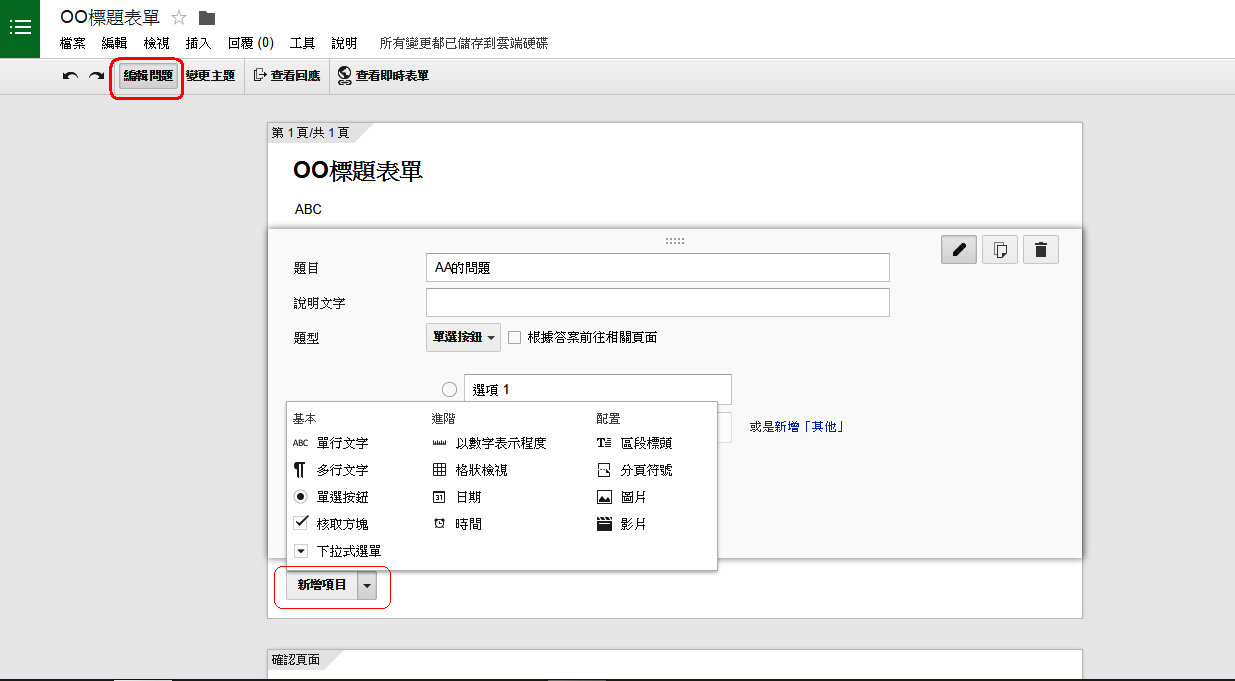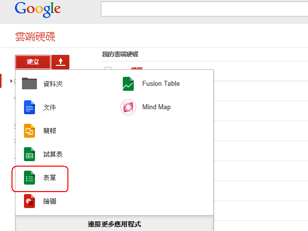 使用「Google雲端硬碟」服務裡面的「表單」來設計問卷調查、報名表或其他填報系統,「Google表單」裡面有多種類型,如圖示。