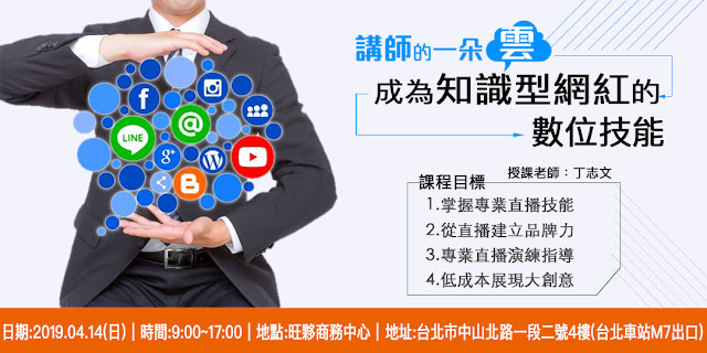 話說前一陣子佔據各大新聞媒體的理科太太,製作短影片和直播而爆紅,影響力之大竟然能和天后蔡依林同台。在這個吸睛就能吸金的年代,學習製作短影片就是現代人的必修課程。所以無論你是想要行銷產品,建立個人品牌,或是單純想和親友分享生活…都可以透過製作短影片來幫你達成任務。 活動介紹 :這堂課(直播技術教學)是學習如何應用攝影工具、電腦、附加配件製作一個相對精緻的專業直播呈現。推薦你參與學習! 課程效益:透過短影片行銷-直播,使您成為「網紅講師」!建立 能見度->擴展 知名度->網紅 指名度。成功完成->講師的個人品牌經營。讓您的課程,邀約不斷。 課程目標:1.掌握專業直播技能2.從直播建立品牌力3.專業直播演練指導4.低成本展現大創意 如何成為知識型網紅的數位技能 課綱 David 發表在 痞客邦 留言(0) 人氣(49)